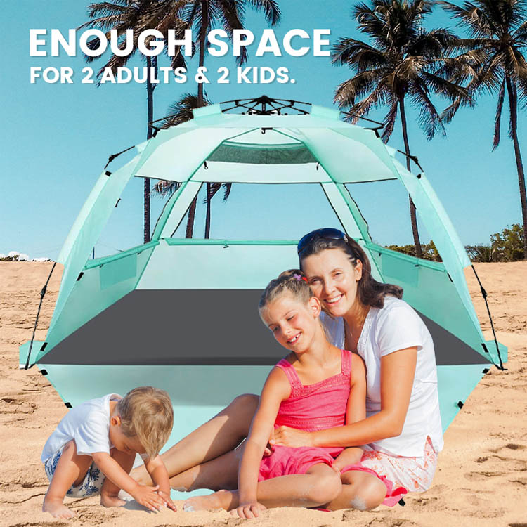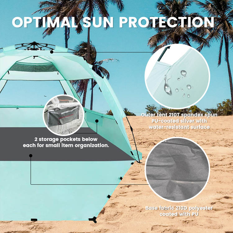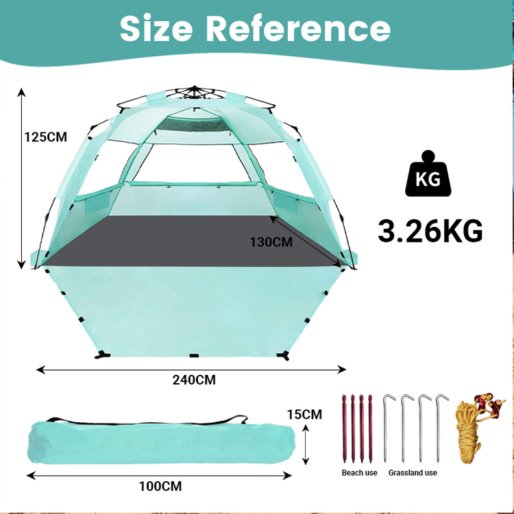 Spetsiaalne hõbedaga kaetud kangas blokeerib 98% kahjulikest UV-kiirtest, säilitades samal ajal suurepärase õhuvoolu, luues jaheda varjulise ala pikemaks rannas viibimiseks.
